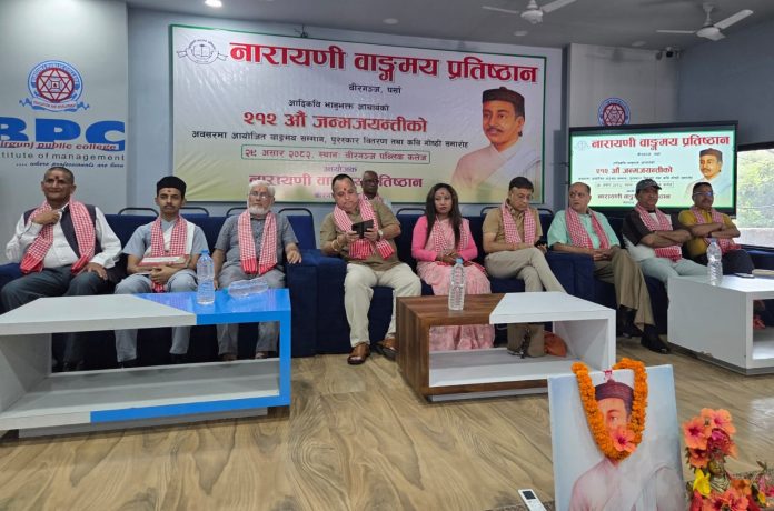वीरगंज । नेपाली भाषा, साहित्य र संस्कृतिका शिल्पी आदिकवि भानुभक्त आचार्यको २१२ औं जन्मजयन्ती वीरगंजमा नारायणी वाङ्मय प्रतिष्ठान, पर्साको आयोजनामा विविध साहित्यिक कार्यक्रमका साथ भव्य रूपमा मनाइएको छ।