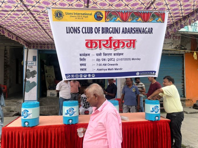वीरगंज । साउन महिनाको दोस्रो सोमबारको पावन अवसरमा लायन्स क्लब अफ वीरगंज आदर्शनगरले धार्मिक आस्थाको केन्द्रको रूपमा परिचित ऐतिहासिक अलखिया मठ मन्दिर अगाडि निःशुल्क चिसो पानी वितरण गरेको छ।