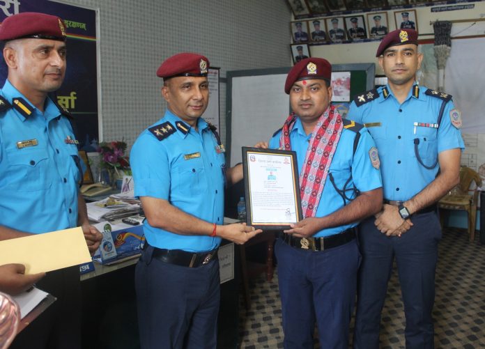 जिल्ला प्रहरी कार्यालयका प्रमुख प्रहरी उपरीक्षक गौतम मिश्रले शुक्रबार प्रमाणपत्रमार्फत उनलाई असार महिनाकाे उत्कृष्ट प्रहरीकाे रुपमा सम्मान गरेका हुन् । साे अवसरमा जिल्ला प्रहरी कार्यालय पर्साका प्रवक्ता एवं प्रहरी नायब उपरिक्षक किशाेर लम्सालकाे समेत उपस्थिती रहेकाे थियाे ।