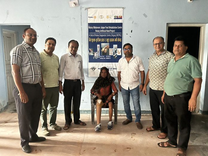 वीरगंज । रोटरी क्लब बीरगंज र माहेश्वरी समाज बीरगंजको संयुक्त पहलमा पर्सा जिल्लाकी एक अपांग महिलालाई निःशुल्क कृत्रिम खुट्टा (तल्लो अप्राकृतिक खुट्टा) प्रदान गरिएको छ।