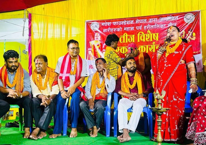 वीरगञ्ज । मधेश फाउण्डेशन नेपालले वीरगञ्ज–१३ स्थित राधेमाई मन्दिरको प्राङ्गणमा तीज विशेष सांस्कृतिक कार्यक्रम आयोजना गरेको छ । संस्थाकी अध्यक्ष श्रीमती पिंकी यादवको अध्यक्षतामा कार्यक्रम उद्घाटन गर्दै रात्री सांस्कृतिक तथा झाँकी प्रस्तुति सुरु गरिएको थियो ।