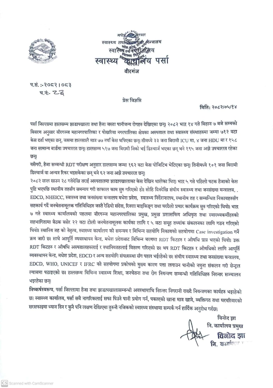 स्वास्थ्य कार्यालय पर्साका निमित्त कार्यालय प्रमुख विनोद झाले शनिबार प्रेस विज्ञप्ती जारी गर्दै हैजासम्बन्धी परीक्षण (RDT) अनुसार हालसम्म १६२ जना बिरामी पोजिटिभ देखिएको जनाएका छन् । तीमध्ये १०१ जना निको भई डिस्चार्ज वा अन्यत्र रिफर भएका छन् भने ६२ जना अझै उपचारमा रहेका छन्।