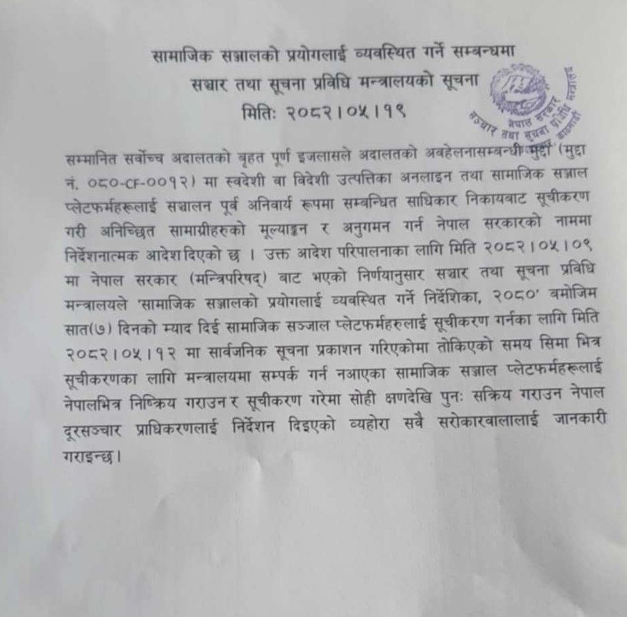 सर्वोच्च अदालतको बृहत पूर्ण इजलासले अदालतको अवहेलनासम्बन्धी मुद्दा नं. ०८०-CF-००१२ मा दिएको आदेशअनुसार नेपाल सरकारले सामाजिक सञ्जाललाई अनिवार्य रूपमा सूचीकरण गर्नुपर्ने व्यवस्था गरेको थियो।