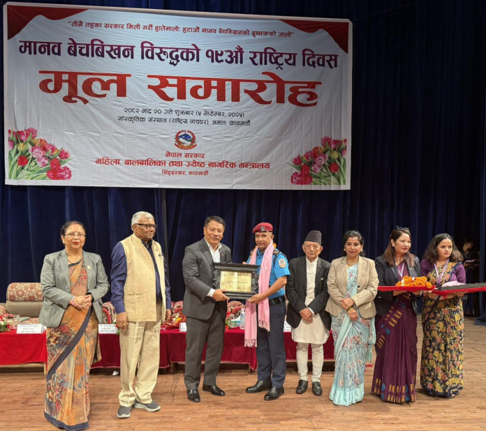 वीरगंज । मानव बेचबिखन तथा ओसारपसारविरुद्धको राष्ट्रिय दिवसका अवसरमा शुक्रबार महिला, बालबालिका तथा जेष्ठ नागरिक मन्त्रालयले जिल्ला प्रहरी कार्यालय पर्साका प्रमुख प्रहरी उपरीक्षक (एसपी) गौतम मिश्रलाई सम्मान गरेको छ।