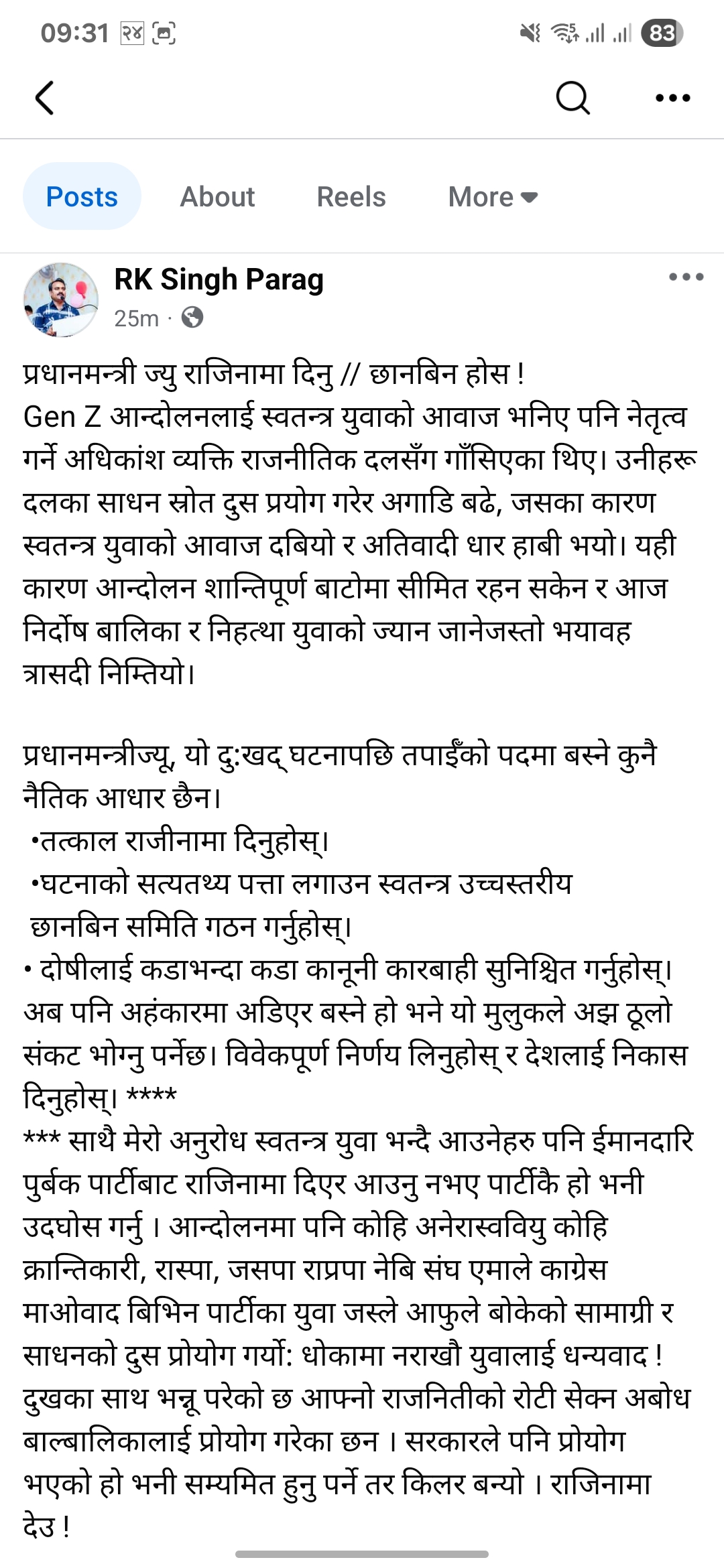 सोमबार सामाजिक सञ्जाल फेसबुकमार्फत उनले जेन जेड आन्दोलनका क्रममा निर्दोष बालबालिका र युवाको ज्यान गएको घटनाले मुलुक स्तब्ध बनेको भन्दै प्रधानमन्त्रीको पदमा बस्ने नैतिक आधार नभएको टिप्पणी गरेका हुन्।