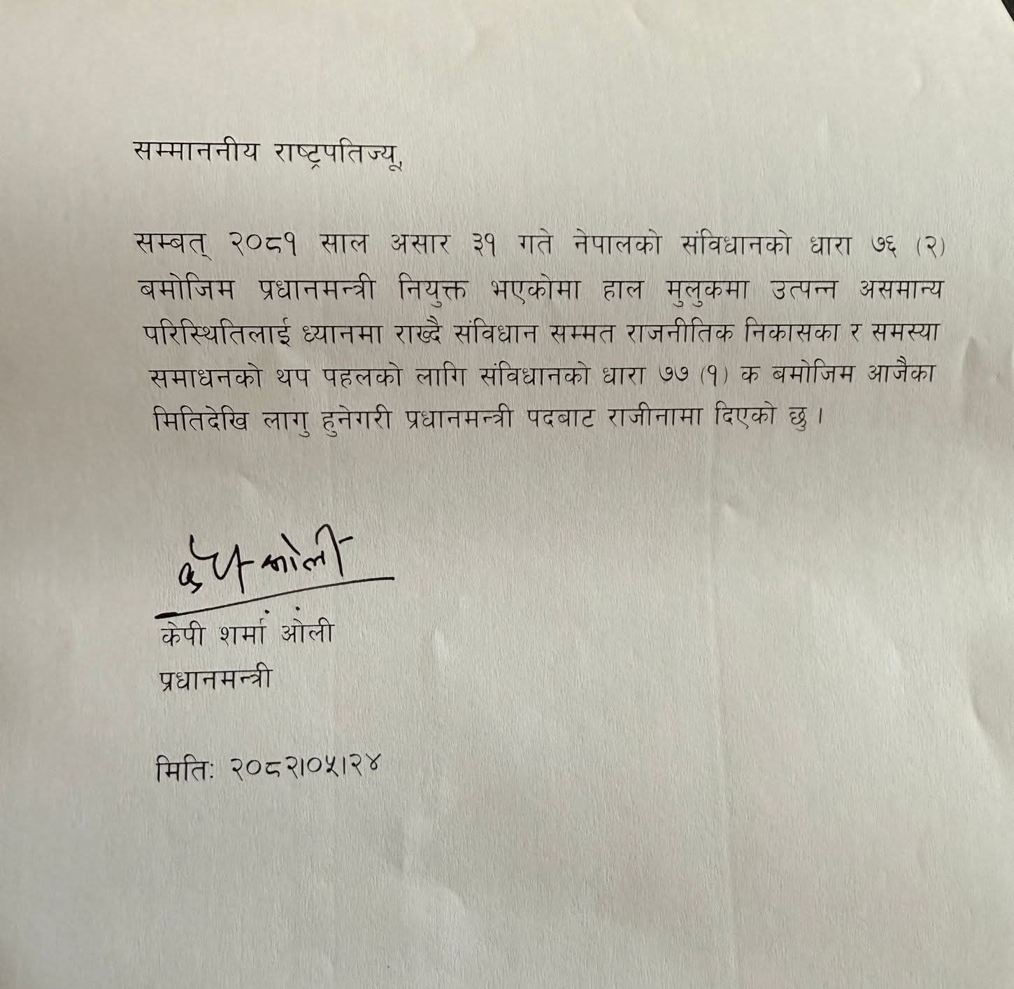 प्रधानमन्त्री ओलीले मुलुकमा उत्पन्न असमान्य परिस्थितिलाई ध्यानमा राख्दै संविधान सम्मत राजनीतिक निकासका र समस्या समाधनको थप पहलको लागि संविधानको धारा ७७ (१) क बमोजिम आजैका मितिदेखि लागु हुनेगरी प्रधानमन्त्री पदबाट राजीनामा दिएको जनाएका छन् ।