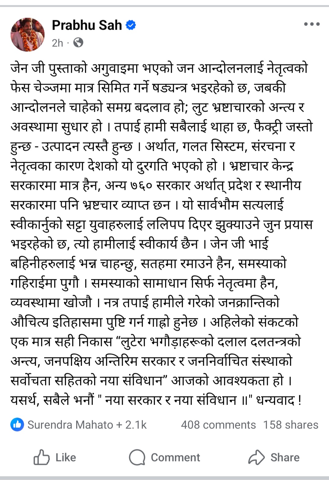 सामाजिक सञ्जालमार्फत प्रतिक्रिया दिँदै साहले आन्दोलनको मूल लक्ष्य समग्र व्यवस्थागत सुधार, लुट–भ्रष्टाचारको अन्त्य र अवस्थाको परिवर्तन भएको उल्लेख गरे।