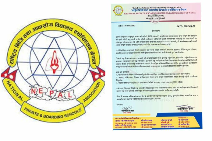 वीरगंज । राष्ट्रिय निजी तथा आवासीय विद्यालय एशोसिएसन नेपाल (एन प्याब्सन), वीरगंजले हाल देशभर चलिरहेको GenZ आन्दोलनका क्रममा वीरगति प्राप्त शहीदहरूप्रति गहिरो श्रद्धाञ्जली अर्पण गरेको छ । एन प्याब्सन वीरगंज महानगर अध्यक्ष जियालाल गुप्ता र नगर सचिव शेख अजहरद्वारा जारी संयुक्त विज्ञप्तिमा शोकसन्तप्त परिवारजनलाई धैर्य र शक्ति प्राप्त होस् भन्दै हार्दिक समवेदना व्यक्त गरिएको छ । साथै आन्दोलनमा गम्भीर घाइते भएकाहरूको शीघ्र स्वास्थ्यलाभको पनि कामना गरिएको छ।