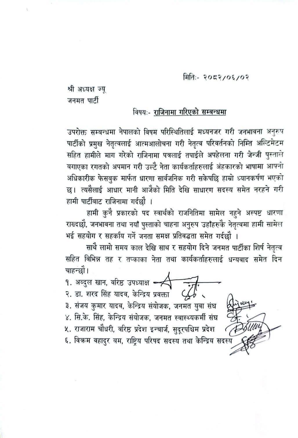 राजीनामा दिने नेताहरूमा वरिष्ठ उपाध्यक्ष अब्दुल खान, केन्द्रीय प्रवक्ता डा. शरद सिंह यादव, जनमत युवा संघका केन्द्रीय संयोजक संजय कुमार यादव, जनमत स्वास्थ्यकर्मी संघका संयोजक सि.के. सिंह, सुदूरपश्चिम प्रदेशका वरिष्ठ इन्चार्ज राजाराम चौधरी र राष्ट्रिय परिषद सदस्य तथा केन्द्रीय सदस्य विक्रम वहादुर बम रहेका छन् ।