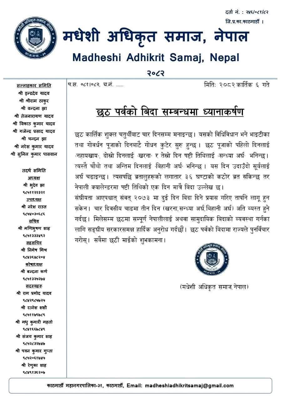 तर नेपाली क्यालेन्डरमा हाल षष्ठी तिथिका लागि मात्र एक दिनको विदा व्यवस्था गरिएको छ। समाजले भनेको छ — “संघीयता आएपछि संवत् २०७३ मा दुई दिन विदा दिने पहल भए पनि त्यो कार्यान्वयन हुन सकेन। छठ पर्वका तीन मुख्य दिनहरू — खरना, सन्ध्या अर्घ र बिहानी अर्घ — अत्यधिक व्यस्त र धार्मिक दृष्टिले महत्वपूर्ण हुने हुँदा त्यसअनुसार विदा मिलाउनुपर्छ।”