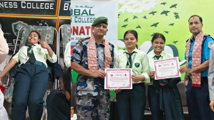 वीरगंज । ग्लोबल बिजनेस क्याम्पस वीरगंजकाे आयाेजनामा साेमबार रक्तदान कार्यक्रम सम्पन्न भएको छ । कार्यक्रममा ३५ महिला सहित १७३ जनाले रक्तदान गरेकाे रक्त संचार केन्द्र वीरगंजले जनाएकाे छ ।