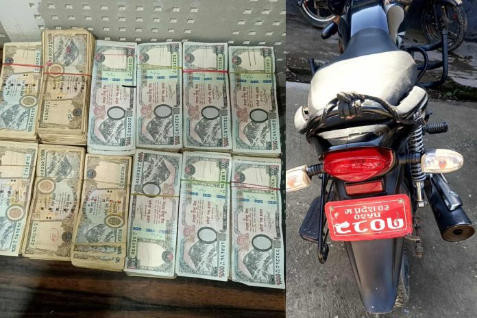 मधेश प्रदेश ०३–०२५ प ९८०७ नम्बरको मोटरसाइकलमा सवार भारत बिहार, मोतीहारी जिल्ला रक्सौल–१ का ५३ वर्षीय सुरेन्द्र साहलाई चेकजाँचका लागि रोकेपछि मोटरसाइकलको बायाँतर्फको एयर फिल्टरभित्र लुकाइ–छिपाइ राखिएको ठूलो परिमाणको रकम फेला परेको जिल्ला प्रहरी कार्यालयका प्रवक्ता प्रहरी नायब उपरीक्षक राजु कार्कीले जानकारी दिए।