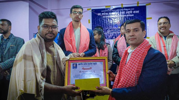वीरगंज । ‘स्वर्गीय नरेश सर्राफ स्मृति पत्रकारिता पुरस्कार–२०८२’ यस वर्ष यात्रा डेली डटकमका डेस्क सम्पादक आशु कुमार सर्राफलाई प्रदान गरिएको छ। वीरगंजका दिवंगत पत्रकार नरेश सर्राफको तेस्रो स्मृति सभाको अवसरमा सोमबार आयोजित कार्यक्रममा पत्रकार सर्राफलाई नगद २१ हजार रुपैयाँसहित सम्मान पत्र प्रदान गरिएको हो।
