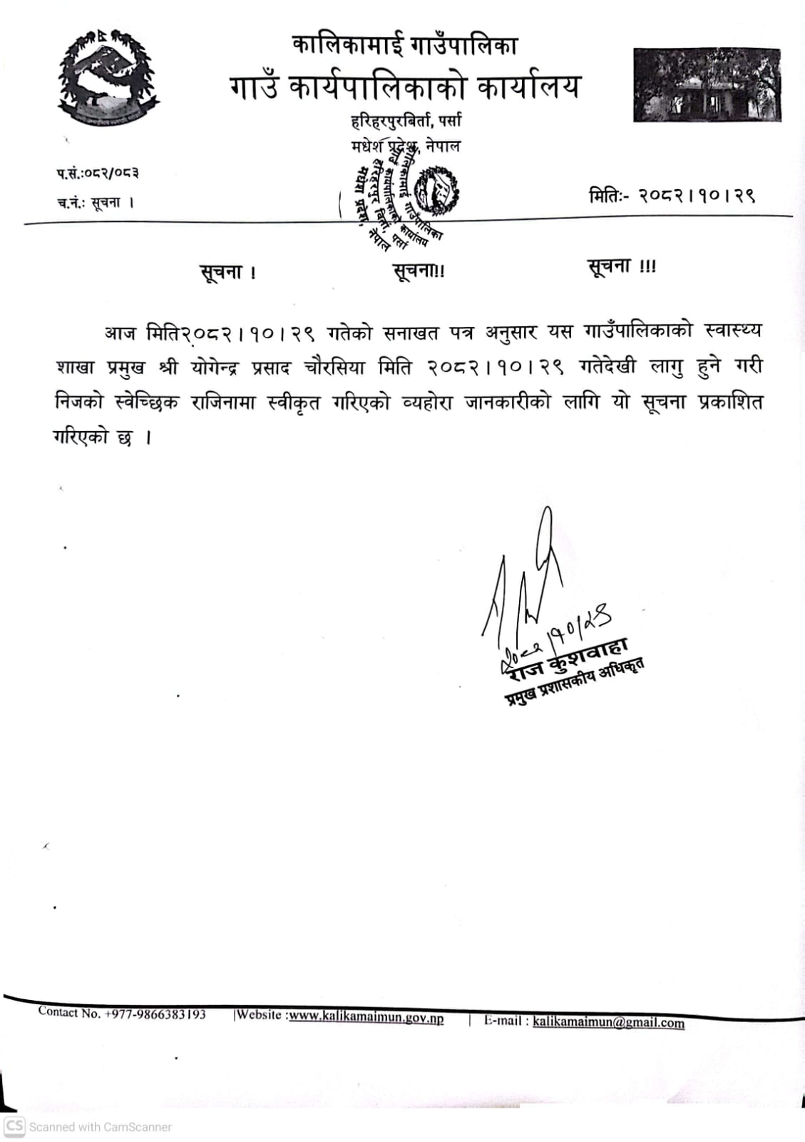 वीरगंज । पर्साको कालिकामाई गाउँपालिका कार्यालयमा सि.अ.हे.व. अधिकृत (छैठौं) तहमा कार्यरत तथा गाउँपालिकाका स्वास्थ्य संयोजक योगेन्द्र प्रसाद चौरसियाको स्वेच्छिक राजिनामा स्वीकृत भएको छ ।