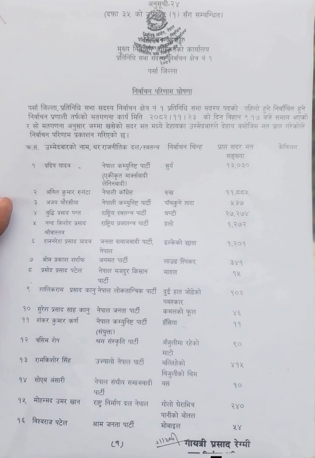 उज्यालो नेपाल पार्टीका रामकिशोर सिंह (पराग) ले ४१५, स्वतन्त्र उम्मेदवार विशाल कुमारले ३८१, जनमत पार्टीका ओमप्रकाश सर्राफले ३४१, पिपुल फस्ट पार्टीका जाबेद एकबाल हैदरले २५२ मत प्राप्त गरेका छन्।
