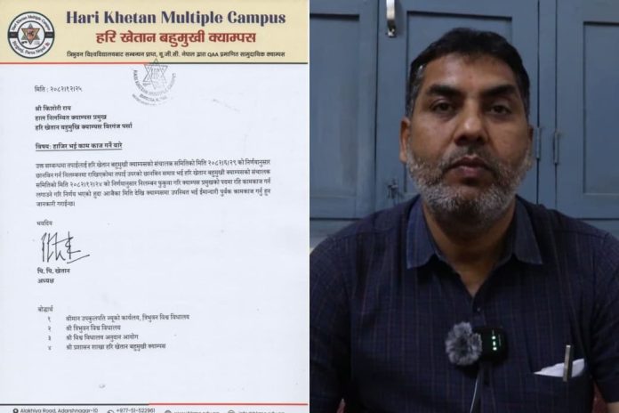 वीरगंज । हरि खेतान बहुमुखी क्याम्पसका क्याम्पस प्रमुख किशोरी राय निलम्बन फुकुवा भएसँगै पुनः आफ्नो पदमा फर्किएका छन्।
