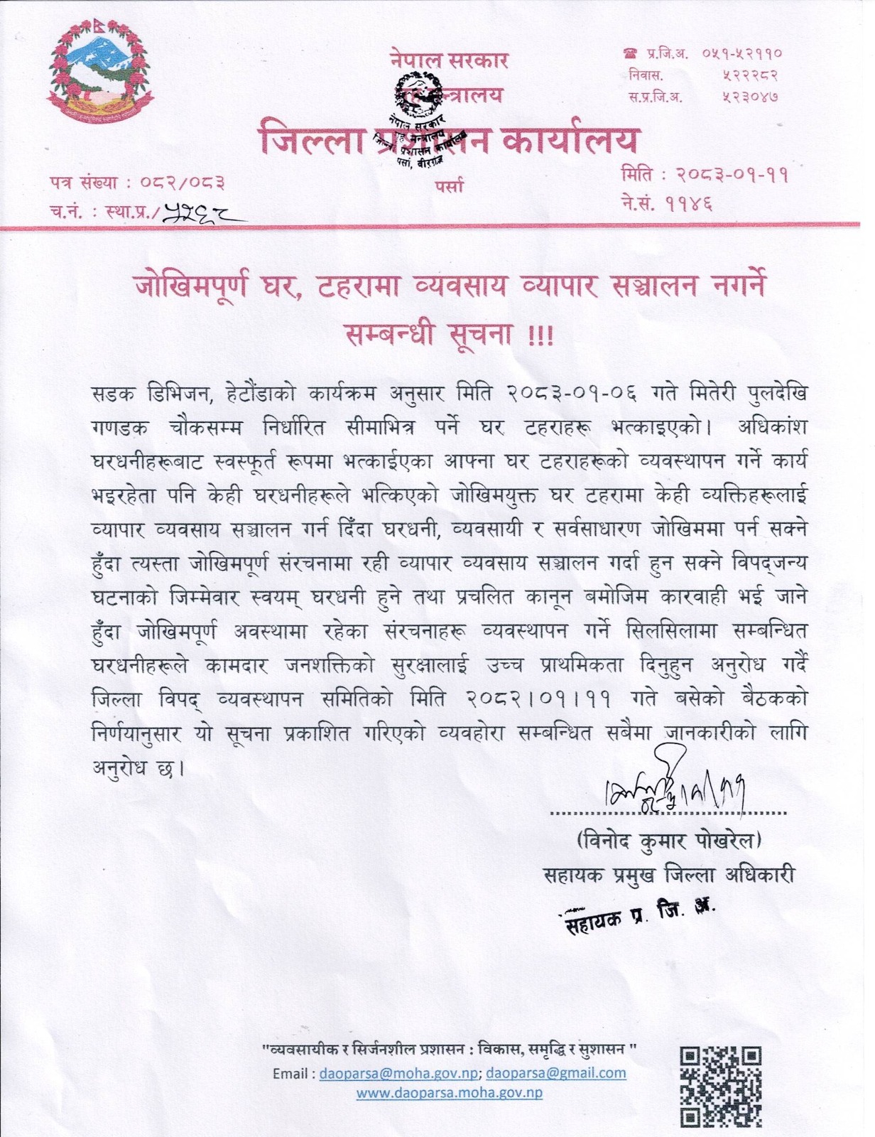 वीरगंज । जिल्ला प्रशासन कार्यालय पर्साले जोखिमपूर्ण अवस्थामा रहेका घर तथा टहरामा व्यापार व्यवसाय सञ्चालन नगर्न सर्वसाधारणलाई आग्रह गरेको छ।